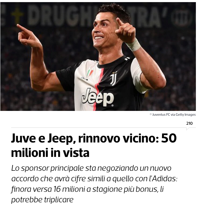 Gioia e felicità in casa bianconera. L’organo ufficiale di stampa del club, l’imparzialissimo Tuttosport, riporta della trattativa ormai in fase avanzata tra i bianconeri e “Jeep”, sponsor principale, che potrebbe arrivare a versare nelle casse del club 50 milioni di euro l’anno rispetto ai precedenti 16 + bonus. Tutto merito dell’effetto CR7 a detta del quotidiano.